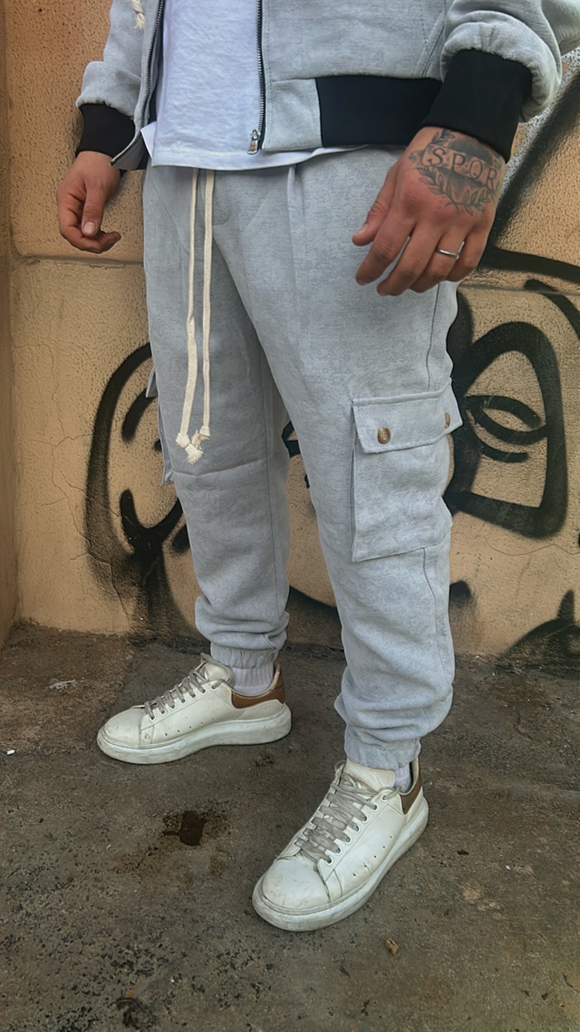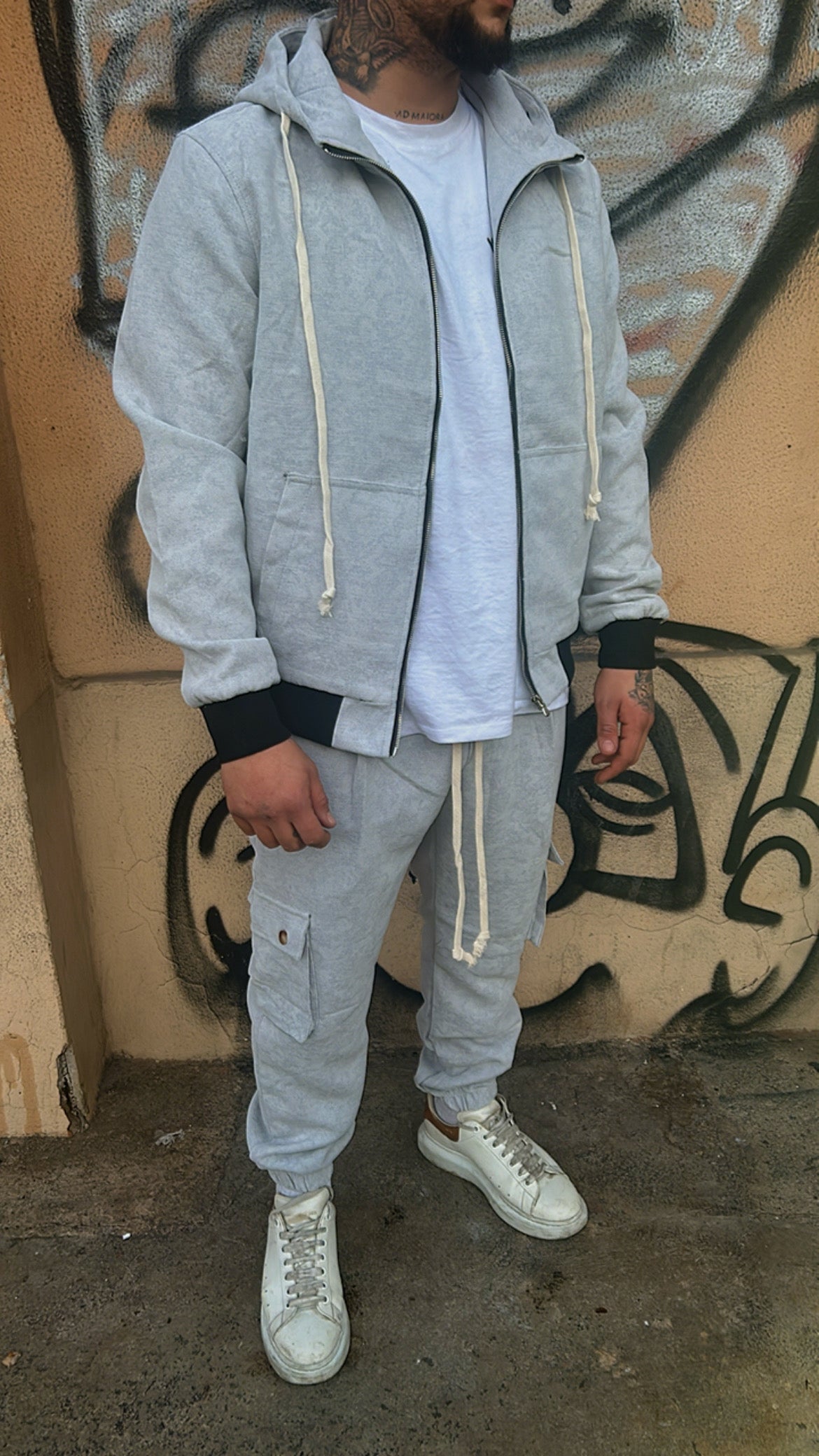 Completo cargo grigio in tessuto ricamato tono su tono